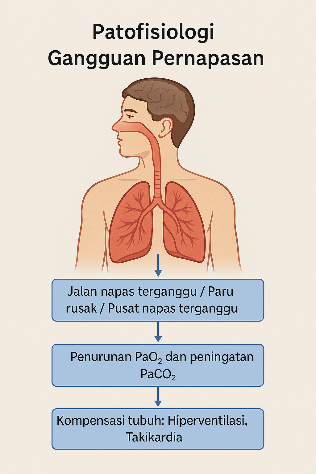 Gangguan pernapasan mengacu pada keadaan di mana proses pertukaran gas dalam tubuh, khususnya mencakup oksigen dan karbon dioksida, terganggu. Gangguan ini bisa disebabkan oleh berbagai kondisi yang mempengaruhi saluran napas, paru-paru, atau pusat regulasi napas. Secara umum, patofisiologi gangguan pernapasan dapat dikategorikan berdasarkan mekanisme yang mendasari, seperti gangguan ventilasi, difusi, perfusi, dan regulasi. Tulisan ini akan mengulas secara rinci mengenai mekanisme patofisiologi gangguan pernapasan, alur terjadinya gangguan.